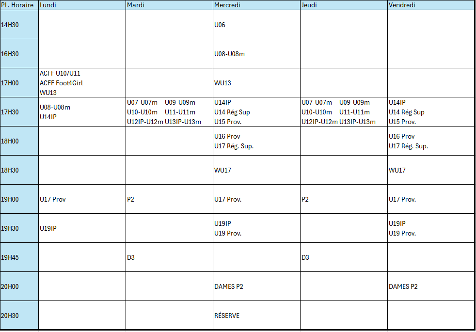 Horaire des entrainements
